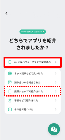 [au U12バリュープランで契約済み]をタップします。 ※「携帯ショップで紹介された」をタップした場合も、同じ遷移先に進みます。