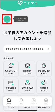 [+]をタップします。 次に、お子さま側の端末を設定します。STEP2へお進みください。