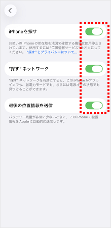 [iPhoneを探す][“探す”ネットワーク][最後の位置情報を送信]のスイッチがオンになっていることを確認されたら、操作は完了です。 ※オフの場合はスイッチをタップしてオンにしてください。