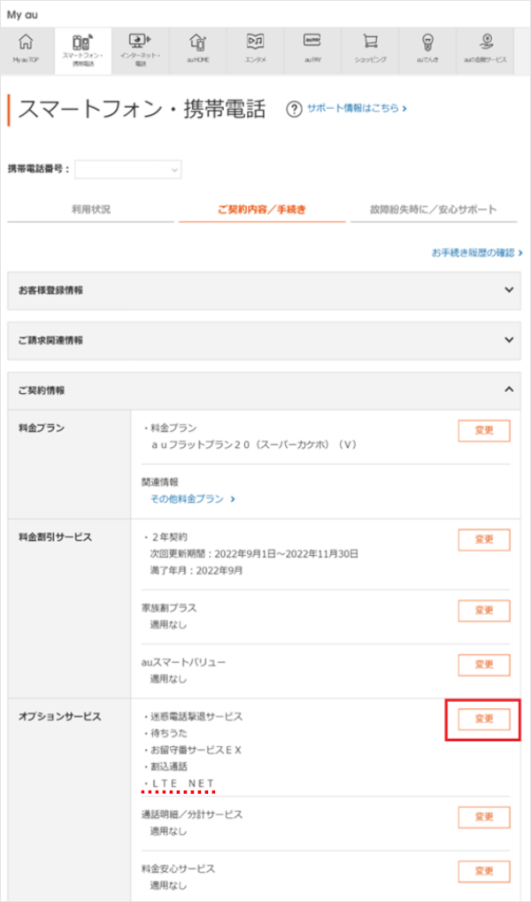 「オプションサービス」欄の「LTE NET」が表示されている項目の[変更]をタップします。