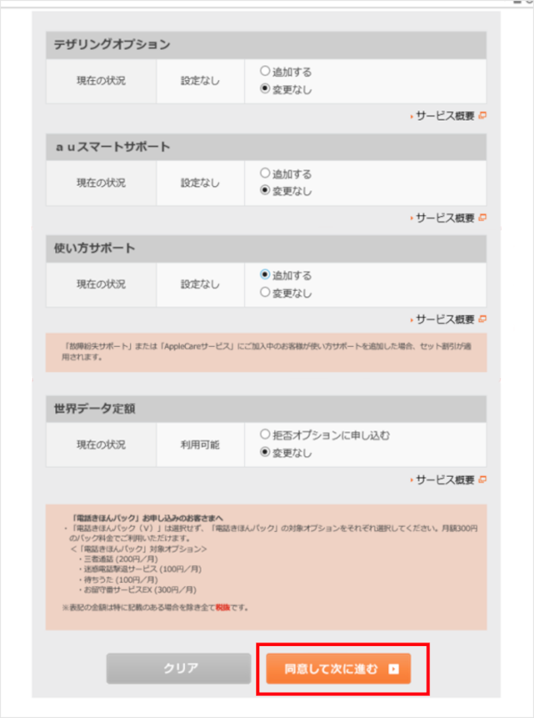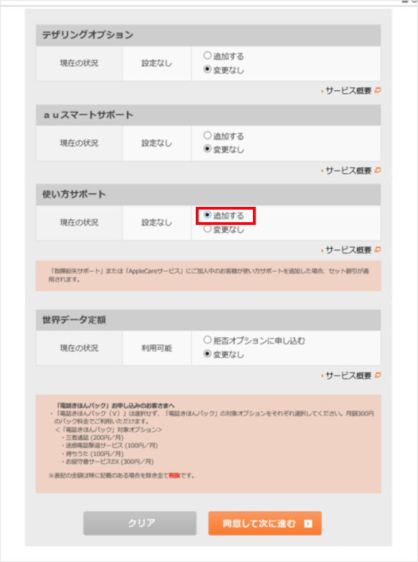 「使い方サポート」の欄が「追加する」になっていることを確認のうえ、お申込完了後に契約内容を確認する方法を選択します。