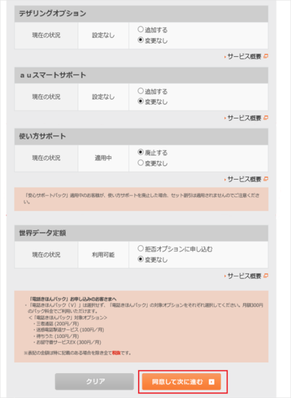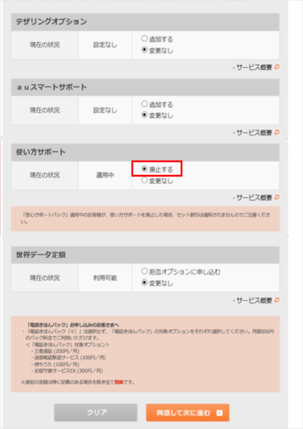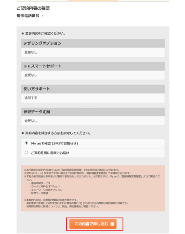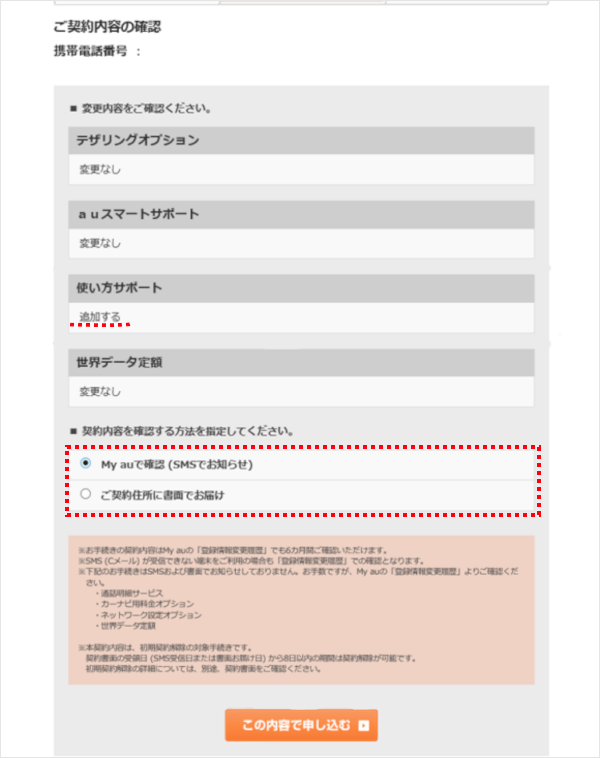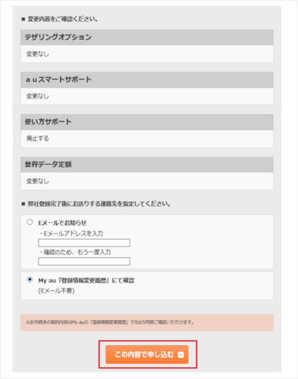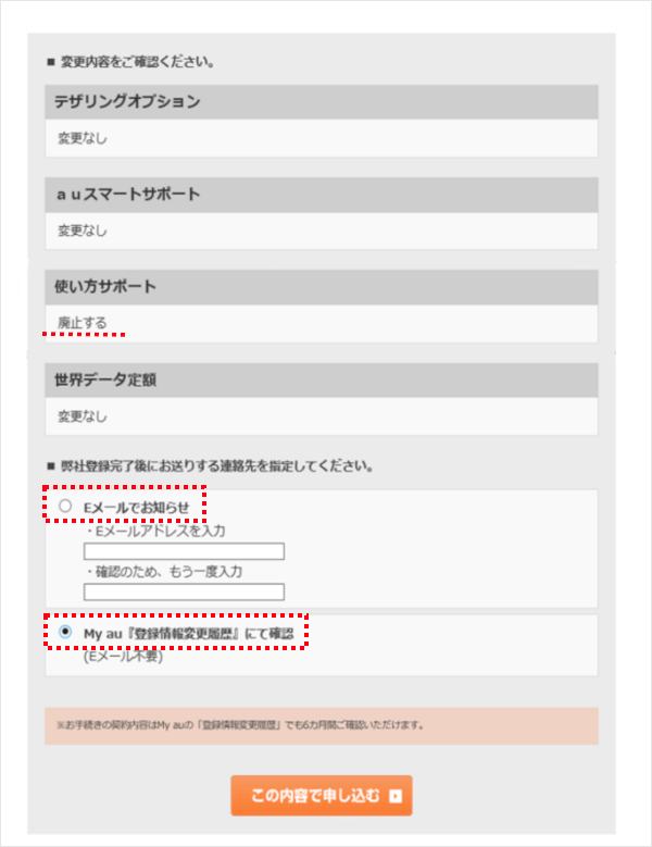 「使い方サポート」の欄が「廃止する」になっていることを確認のうえ、お申込完了後に契約内容を確認する方法を選択します。