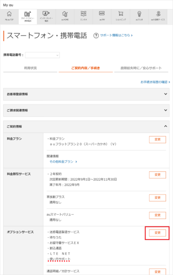 オプションサービス欄に「使い方サポート」が表示されていることを確認し、[変更]をタップします。