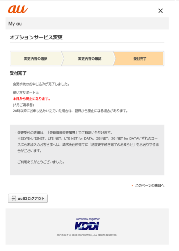 「受付完了」の画面が表示されます。 以上で退会のお手続きは完了です。