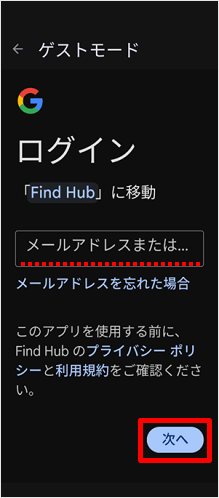 Google アカウントを入力して[次へ]をタップします。 ※入力するGoogle アカウントは、盗難・紛失中のAndroidに設定されているGoogle アカウントです。