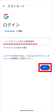 盗難・紛失中のAndroid端末に設定されている「メールアドレス」もしくは「電話番号」を入力し、[次へ]をタップします。