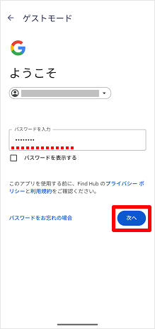 「パスワード」を入力し、[次へ]をタップします。