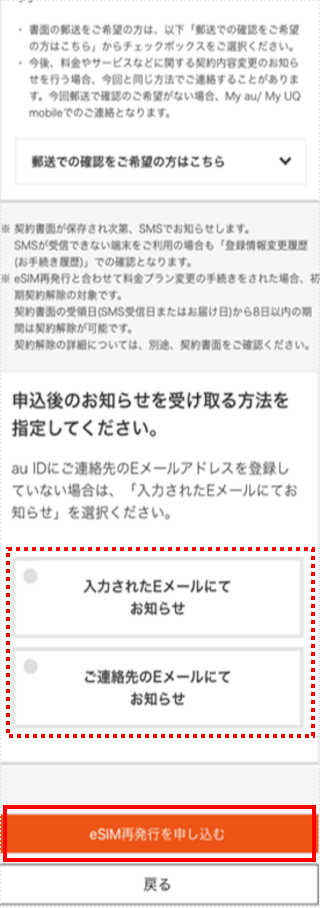 申込後のお知らせ受取方法を選択して[eSIM再発行を申し込む]をタップします。