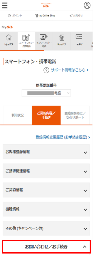 スマートフォン・携帯電話タブの[お問い合わせ/お手続き]をタップして開きます。