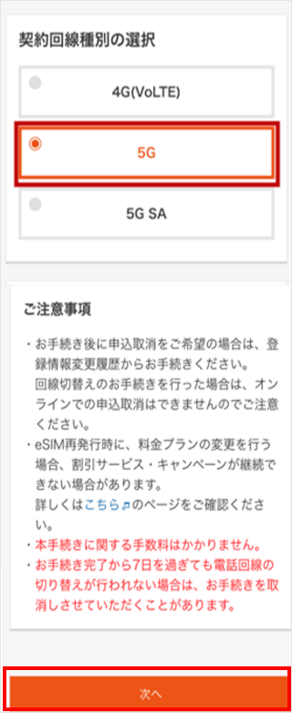 [5G]を選択し、[次へ]をタップします。