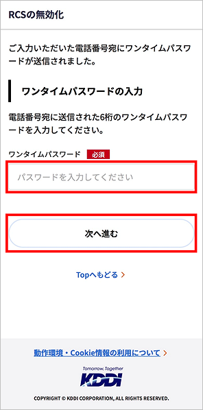入力した電話番号宛に届いたワンタイムパスワードを入力し、[次へ進む]をタップします。