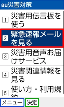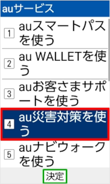 「au災害対策を使う」を選択し、[センターキー]を押します。